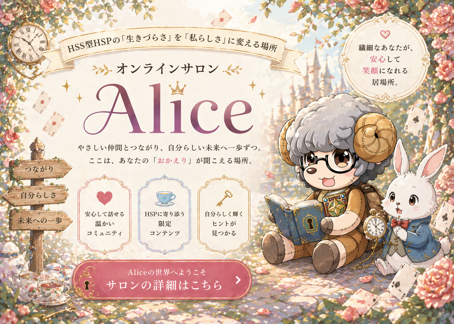 サロンAliceでは、HSS型HSPの特性を理解し、それを最大限に活かすための情報提供やコンテンツ、交流の場を提供しています。メインコンテンツは「Aliceブレインクリアプログラム」になります。